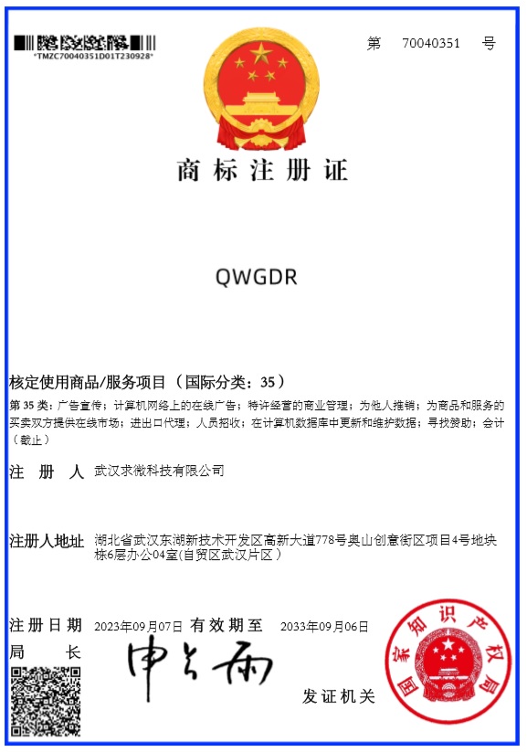 QWGDR文字商标和图形商标第42类、第35类、第9类注册通过